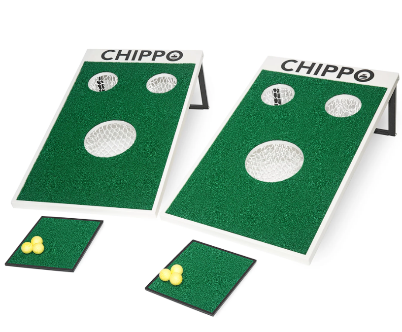 It’s cornhole for chipping. Great for backyard fun and hand-eye coordination.